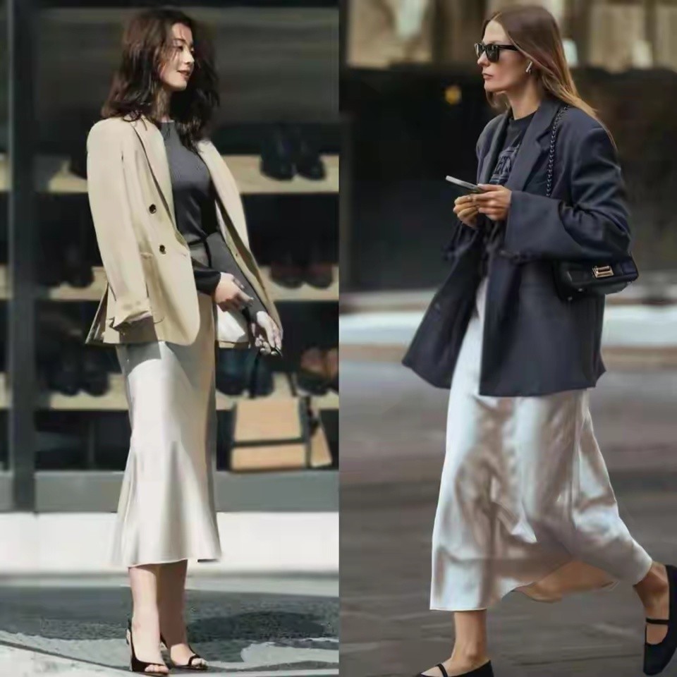 甚至我们还可以做内搭,例如下面用西服搭配上缎绸面料的半身裙,内搭的衣服就是针织衣服单品,这一件灰色的针织衣服单品作为内搭厚度合适,而且还能展现出女性的温柔和气质,这样的搭配让你秒变成大女主的气质。