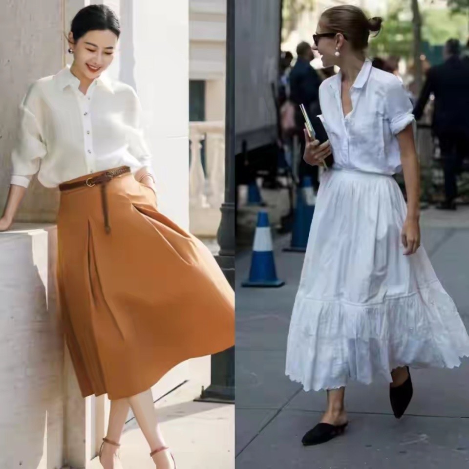 但是面料一定要好,例如右边的这一件白色衬衫和白色半身裙,一眼看上去就显得廉价,衣服面料皱皱巴巴的,怎么穿都很难穿出高级感。